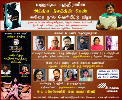 நாளை நடைபெறும் நண்பர் மனுஷ்யபுத்திரனின் கவிதைத் தொகுப்பு வெளியீட்டு விழாவிற்கு என் மனம் நிரம்பிய வாழ்த்துகள்