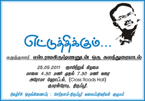 சேர்தளம் மற்றும் திருப்பூர் வலைப்பதிவு நண்பர்கள் நடத்தும் கலந்துரையாடல் நிகழ்வு 25ம் தேதி ஞாயிற்றுகிழமை மாலை 4.30 முதல் இரவு 7.30 வரை அரோமா ஹோட்டலில் நடைபெற இருக்கிறது, விருப்பமான வாசகர்கள், நண்பர்கள் அனைவரும் கலந்து கொள்ளலாம்.