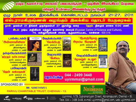 நவம்பர் 21 முதல் 27 வரை சென்னை ருஷ்யக் கலாச்சார மையத்தில் ஏழு நாட்கள் உலக இலக்கியம் குறித்து தொடர் சொற்பொழிவு நடத்த இருக்கிறேன்,
