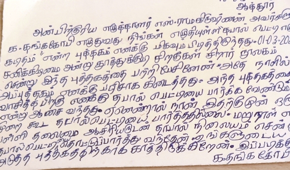 எனது தபால்பெட்டி எழுதிய கடிதம் சிறார் நூலை வாசித்துவிட்டு தங்ககோபி என்ற மாணவன் அஞ்சல் அட்டை அனுப்பி வைத்திருக்கிறான். அதில் முதன்முறையாக தான் தபால் பெட்டியை பார்த்த அனுபவம் பற்றி எழுதியுள்ளான். படிக்கவே மகிழ்ச்சியாக உள்ளது.