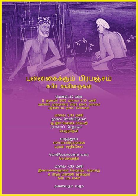 செங்கதிர் அவர்களின் மொழியாக்கத்தில் கபீரின் கவிதைகள் வெளியாகின்றன. புன்னகைக்கும் பிரபஞ்சம் என்ற இந்நூலின் வெளியீட்டுவிழா ஜனவரி 11 மாலை அண்ணா நூற்றாண்டு நூலக அரங்கில் நடைபெறவுள்ளது 0Shares0