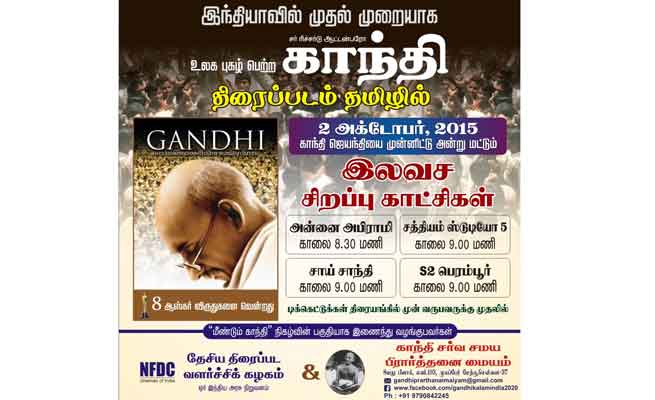 காந்தி சர்வ சமய பிரார்த்தனை மைய நண்பர்கள் NFDC உதவியுடன் வருகின்ற அக்டோபர் 2 காந்தி ஜெயந்தி நாளன்று சென்னையில் உள்ள சத்தியம்,அபிராமி,சாந்தி,பெரம்பூர் எஸ்2 ஆகிய நான்கு தியேட்டர்களில் காலைக்காட்சியாக ரிச்சர்ட் அட்டன்பரோ இயக்கிய காந்தி படத்தின் தமிழ் வடிவத்தை இலவசமாகத் திரையிட உள்ளார்கள். அனைவரும் இந்த நிகழ்வில் கலந்து கொள்ளும்படி அழைக்கிறேன்.