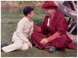 லாமாவின் சீடனாக இணைந்து கொள்ளும் கிம் அவருடன் நதியைத் தேடிப் பயணிக்கிறான். போகும் ஊர்களில் லாமாவிற்காக உணவு கேட்டுக் கிம் யாசிக்கிறான். எவரும் உணவளிக்க முன்வருவதில்லை. உடனே கிம் பொய் சொல்லி தந்திரம் செய்து உணவைப் பெறுகிறான்.
