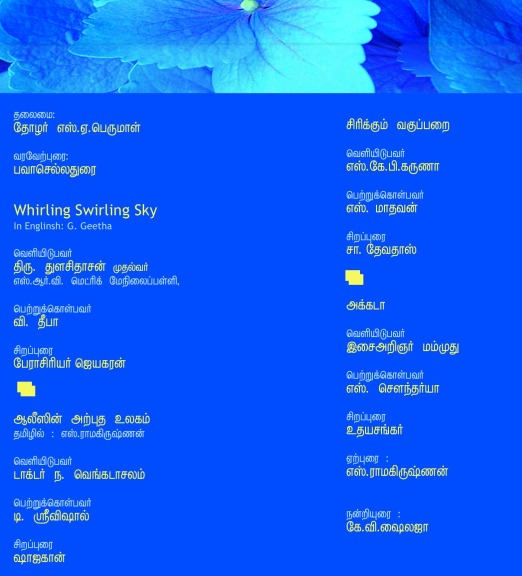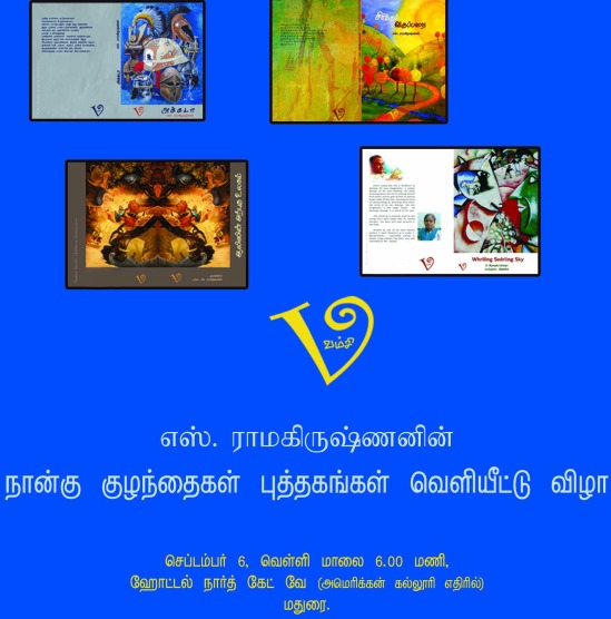சிறார்களுக்காக நான் எழுதியுள்ள சிரிக்கும் வகுப்பறை, அக்கடா, எனும் இரண்டு சிறுநாவல்கள், கிறுகிறுவானம் நூலின் ஆங்கில மொழிபெயர்ப்பான Whirling Swirling Sky ,ஆலீஸீன் அற்புத உலகம் நூலின் புதிய பதிப்பு, என நான்கு புத்தகங்கள் மதுரையில் வெளியிடப்பட இருக்கின்றன