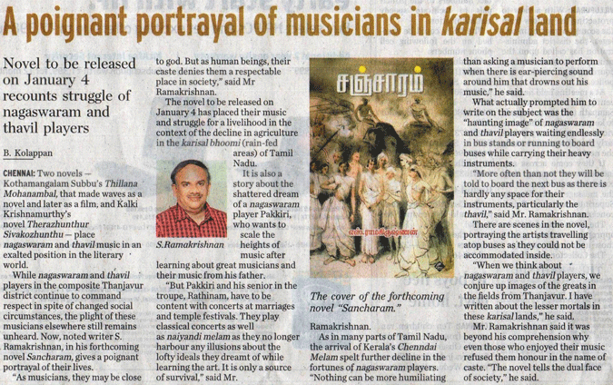 இன்றைய ஆங்கில ஹிந்து நாளிதழில் எனது புதிய நாவல் சஞ்சாரம் குறித்து நண்பர் கோலப்பன் எழுதியிருக்கும் பதிவு.