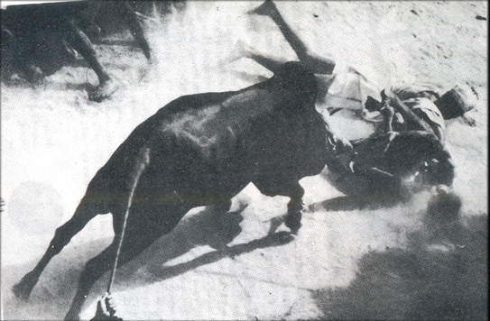 காளையைப் பொருந்தும் அரிய தருணம் பதிவு செய்யப்பட்டிருக்கிறது, வாலை இழுத்து பிடித்துள்ள மனிதனின் கை ஒரு புறம், தூக்கி எறியப்பட்டு வீழ்ந்துகிடக்கும் மனிதன் மறுபுறம், ஆவேசத்துடன் பாயும் காளையின் சீற்றம், வேகமெடுத்த அதன் உடற்திமிறல், ஒடுங்கிய நிழல். எழுந்து பரவிய புழுதி, பதறியோடும் கால்கள் என இந்தப் புகைப்படம் தரும் மனவெழுச்சி நிகரற்றது.