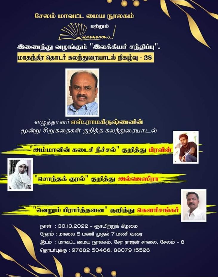 சேலம் மாவட்ட மைய நூலகம் மற்றும் வாசக சாலை இணைந்து நடத்தும் இலக்கியச் சந்திப்பு நிகழ்வில் எனது சிறுகதைகள் பற்றிய கலந்துரையாடல் நாளை மாலை நடைபெறுகிறது.