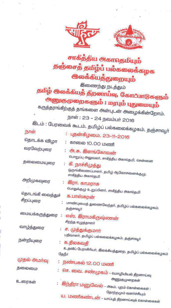 நாளை (23 .11.2016 ) தஞ்சை பல்கலைகழகத்தில்  சாகித்ய அகாதமி நடத்தும் தமிழ் இலக்கியத் திறனாய்வு, கோட்பாடுகளும் அணுகுமுறைகளும் : மரபும் புதுமையும் கருத்தரங்கில் கலந்து கொண்டு மையக்கருத்துரையாற்றுகிறேன்