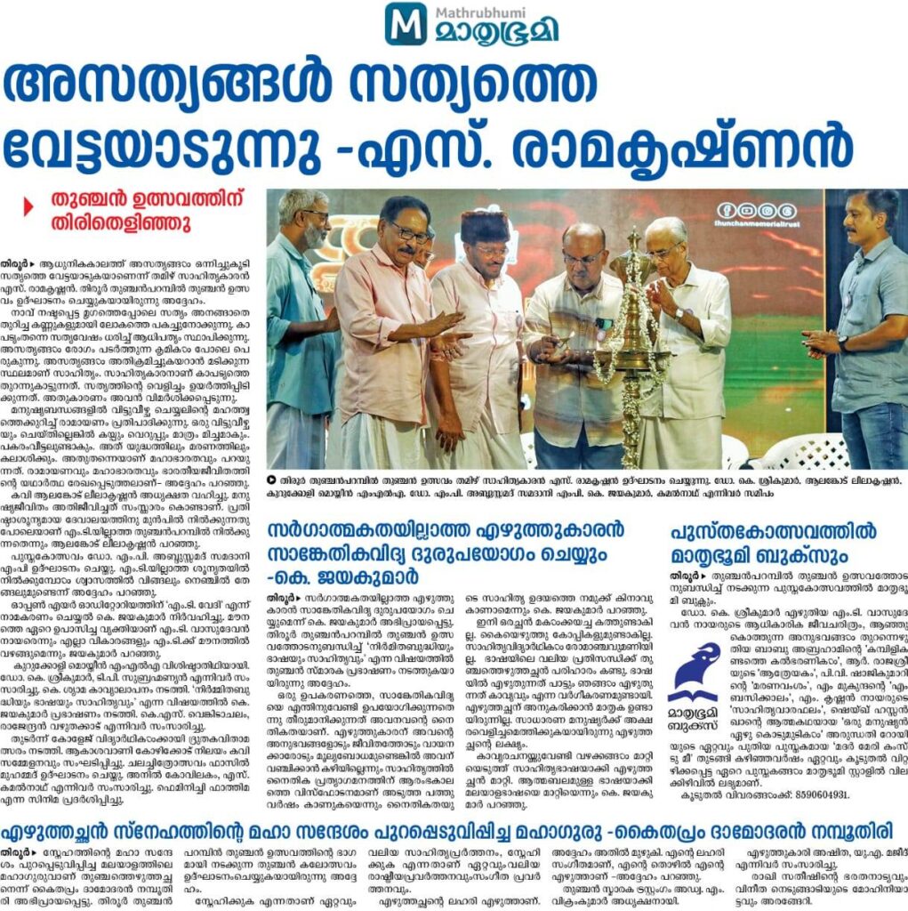 கேரளாவில் நடைபெற்ற துஞ்சன் இலக்கிய விழாவைத் துவக்கி வைத்து உரையாற்றினேன். பிரம்மாண்ட அரங்கு. திரளான மக்கள் கூட்டம். எழுத்தச்சனின் புகழ்பாடும் நிகழ்வுகள். நிறைய எழுத்தாளர்களும் கலைஞர்களும் வந்திருந்தார்கள். மறைந்த எழுத்தாளர் எம்.டி.வாசுதேவன் நினைவாக திறந்த வெளி அரங்கம் அமைக்கபட்டிருந்தது. எம்.டி. வாசுதேவன் நாயரின் வாழ்க்கை வரலாறு விரிவான நூலாக வெளியாகியுள்ளது. புத்தகத் திருவிழாவில் அந்த நூலை எழுத்தாளர் ஸ்ரீகுமாரிடமிருந்து நான் பெற்றுக் கொண்டது மகிழ்ச்சி அளித்தது.