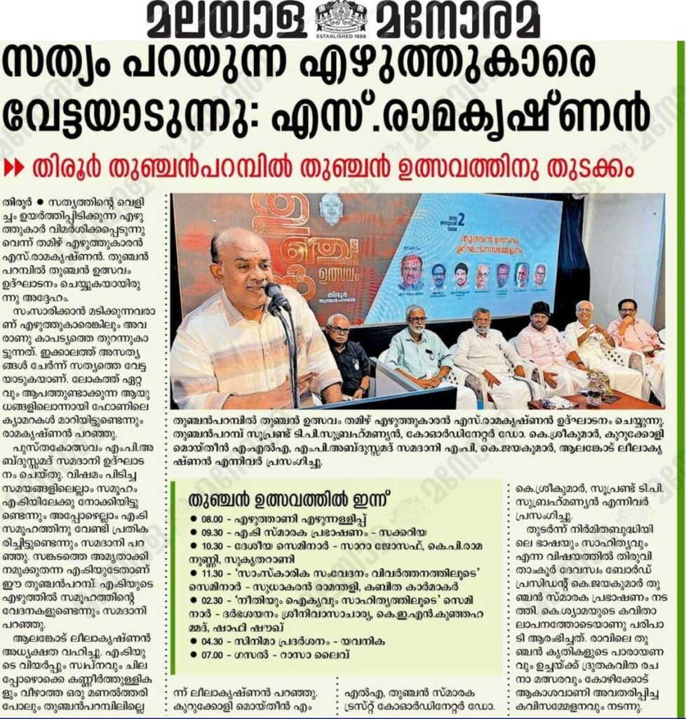 துஞ்சன் இலக்கிய விழாவில் . துஞ்சன்பரம்பு மேற்பார்வையாளர் டி.பி.சுப்பிரமணியன் , ஒருங்கிணைப்பாளர் டாக்டர் கே.ஸ்ரீகுமார், கே.ஜெயக்குமார் IAS, குருக்கோழி மொய்தீன் எம்எல்ஏ, அப்துல் ஸமது சமதானி எம்பி, கவிஞர் ஆலங்கோடு லீலாகிருஷ்ணன் ஆகியோர் கலந்து கொண்டு உரையாற்றினார்கள்.