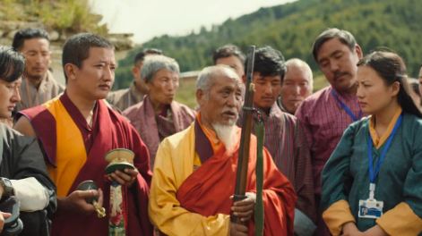 வேறு ஒரு காட்சியில் பெட்டிக்கடை சிறுமி சிறுமி. ஜேம்ஸ்பாண்ட் படத்தை ஆசையாக ஒட்டுகிறாள். தாஷி தனக்கு இரண்டு ஏ.கே.47 துப்பாக்கிகள் வேண்டும் என்கிறான். பூட்டானில் துப்பாக்கி விற்பனை ரகசியமாக நடைபெறுவதைப் படம் சித்தரிக்கிறது.