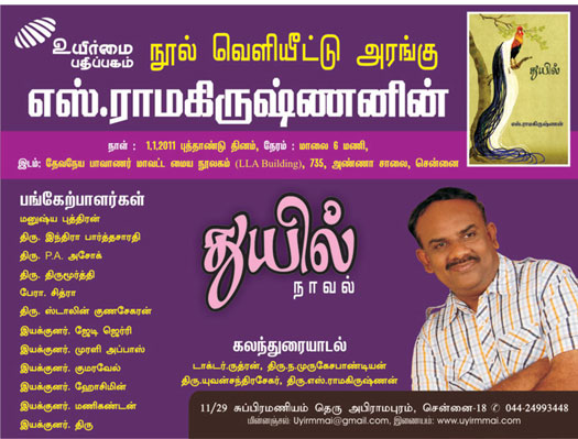 எனது புதிய நாவல் துயில் ஜனவரி 1 2011 அன்று (1.1.11) மாலை 6 மணி அளவில் சென்னை அண்ணாசாலையில் உள்ள தேவநேயப் பாவணர் நூலக அரங்கில் வெளியிடப்பட உள்ளது. நண்பர்கள் அனைவரும் கலந்து கொண்டு விழாவைச் சிறப்பிக்க வேண்டுகிறேன் 0Shares0