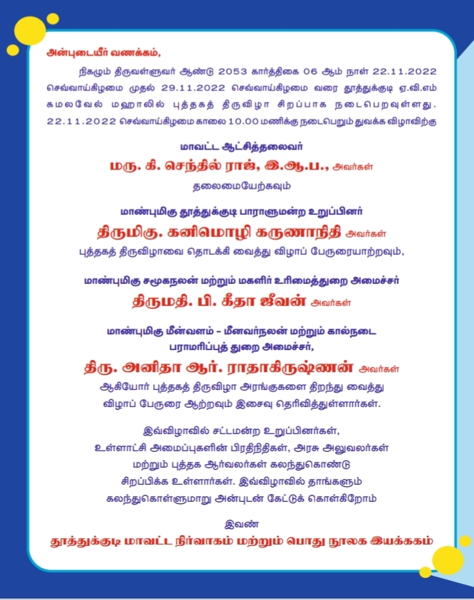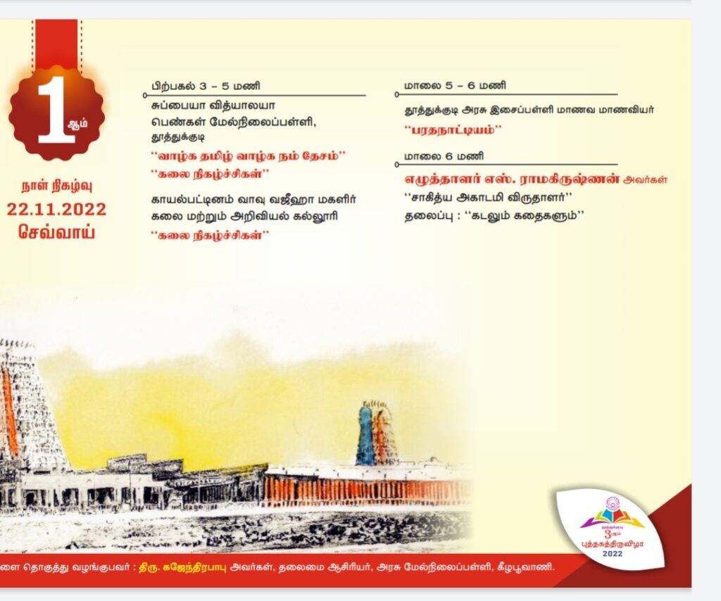 நாளை தூத்துக்குடி புத்தகத் திருவிழா துவங்குகிறது. முதல்நாளின் மாலை நிகழ்வில் உரையாற்றுகிறேன். ( 22.11.22) 0Shares0