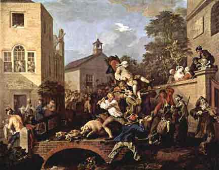 இங்கிலாந்தில் 1754ல் நடைபெற்ற பாராளுமன்றத் தேர்தலில் நடந்த முறைகேடுகள், வேட்பாளர்களின் ஆடம்பர நடவடிக்கை, மற்றும் ஒட்டுப்பதிவில் நடைபெற்ற லஞ்சம், வெற்றிக்குப் பிறகு தலைகால் தெரியாமல் ஆடுகின்ற நிலை ஆகிய நான்கு நிலைகளையும் ஒவியமாக வரைந்திருக்கிறார்