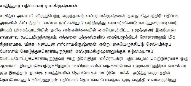 நிறைய வாசகர்கள் எனது புத்தகங்களில் கையெழுத்து வாங்கிக் கொண்டார்கள். புகைப்படம் எடுத்துக் கொண்டார்கள். பரஸ்பரம் மகிழ்ச்சியைப் பகிர்ந்து கொள்ளும் நிகழ்வாகவே அதைக் காண்கிறேன்
