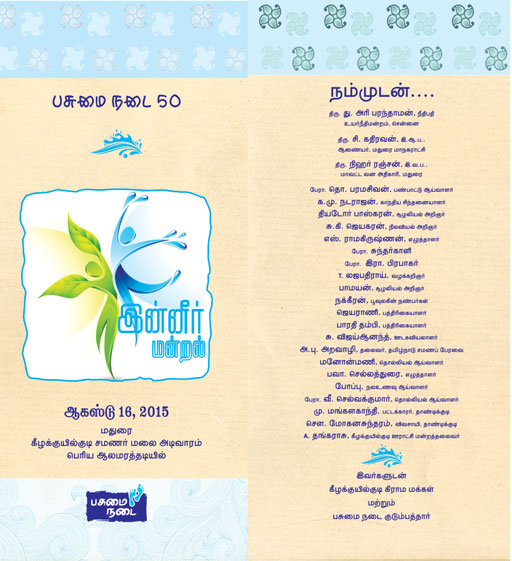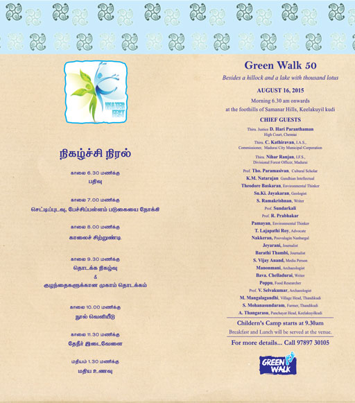 பசுமை நடையின் ஐம்பதாவது நிகழ்வை சிறப்பிக்கும் விதமாக மதுரையில் வருகின்ற ஆகஸ்ட் 16ம் தேதி காலை கீழக்குயில்குடி சமணர் மலையடி வாரத்தில் இன்னீர் மன்றல் விழா நடைபெற உள்ளது.