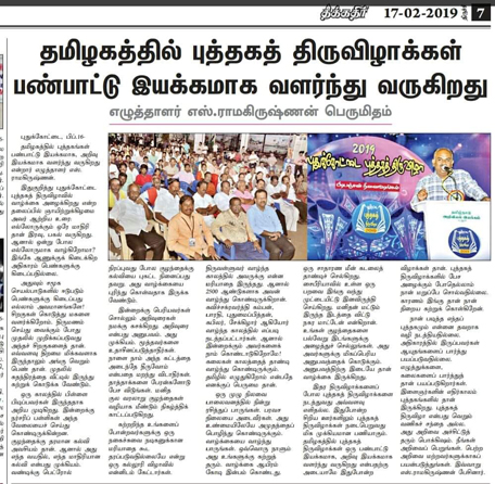 புதுக்கோட்டை புத்தகத் திருவிழா மூன்றாம் ஆண்டில் சிறப்பாக துவங்கியுள்ளது. 15.02.2019 துவக்க நாளின் உரையை நான் நிகழ்த்தினேன். நண்பர் தங்கம் மூர்த்தி இதற்கு முக்கிய காரணமாக விளங்கினார். தேசாந்திரி பதிப்பகம் இந்த கண்காட்சியில் அரங்கு அமைத்துள்ளது. கவிஞர் முத்துநிலவன், பேராசிரியர் கருப்பையா, வரதன் உள்ளிட்ட நண்பர்கள் பலரையும் சந்திக்க முடிந்தது மகிழ்ச்சி அளித்தது. நிகழ்வை ஒருங்கிணைத்த அனைவருக்கும் நன்றிகள்