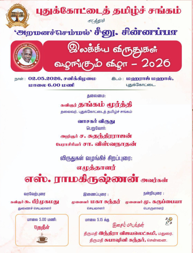 அறமனச் செம்மல் சீனு. சின்னப்பா இலக்கிய விருதுகள் வழங்கும் விழா மே 2ல் புதுக்கோட்டையில் நடைபெறுகிறது.