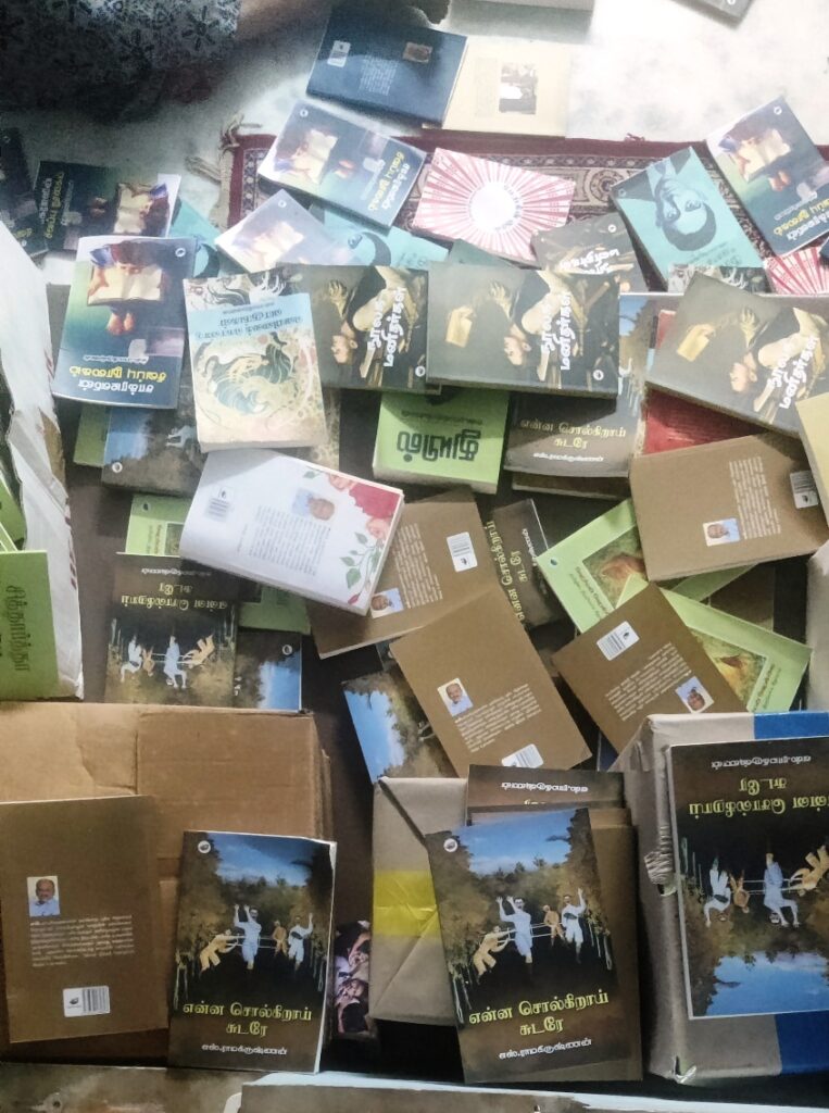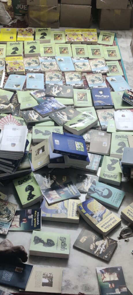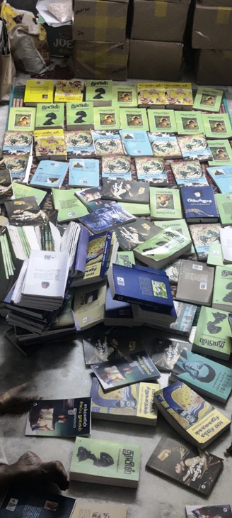 செய்வதறியாமல் அவற்றைப் பார்த்துக் கொண்டிருக்கிறேன். இந்த இழப்பு எங்களுக்கு பெரியது. இருபது லட்ச ரூபாயிற்கும் மேலான புத்தகங்கள் சேதமாகியிருக்க கூடும். மீதமுள்ள புத்தகங்களைக் காப்பாற்றி கொண்டு வந்து வீடு முழுவதும் நிரப்பியிருக்கிறோம்.