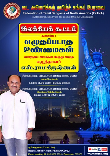 வட அமெரிக்கத் தமிழ்ச் சங்கப் பேரவை (FeTNA) சார்பில் ஏற்பாடு செய்யப்பட்டுள்ள இணைய வழி இலக்கிய நிகழ்வில் கலந்து கொண்டு உரையாற்றுகிறேன்.