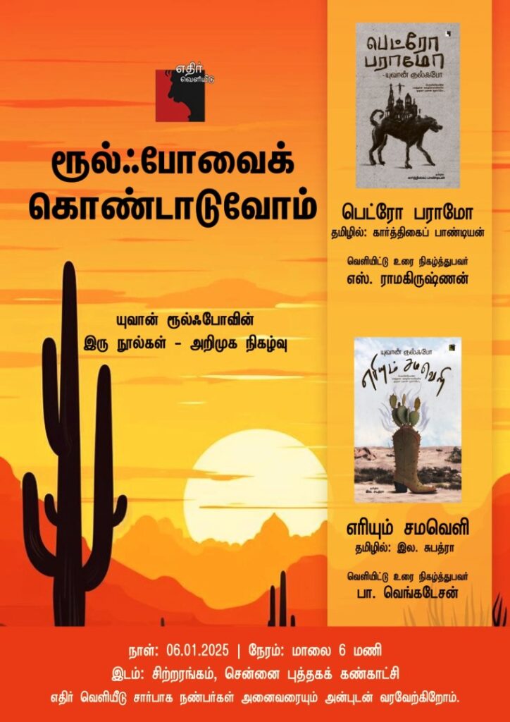 நண்பர் கார்த்திகைப் பாண்டியன் மொழியாக்கத்தில் வெளியாகியுள்ள பெட்ரோ பராமோ நாவலின் அறிமுகக் கூட்டம் ஜனவரி 6 திங்கள்கிழமை மாலை சென்னைப் புத்தகத் திருவிழா அரங்கிலுள்ள சிற்றரங்கில் நடைபெறுகிறது. அதில் கலந்து கொண்டு உரையாற்றுகிறேன்.