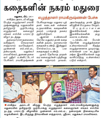 மதுரை எட்வர்ட் ஹாலில் தமிழ்நாடு முற்போக்கு கலைஞர்கள் எழுத்தாளர்கள் சங்கம் சார்பில் பாராட்டுவிழா நடைபெற்றது. நிகழ்வை மாவட்ட செயலாளர் சாந்தாராம் சிறப்பாக ஏற்பாடு செய்திருந்தார். நிறைய இளைஞர்கள் கூட்டம். இருக்கைகள் நிரம்பி நிறையப் பேர் நின்று கொண்டேயிருந்தார்கள்.