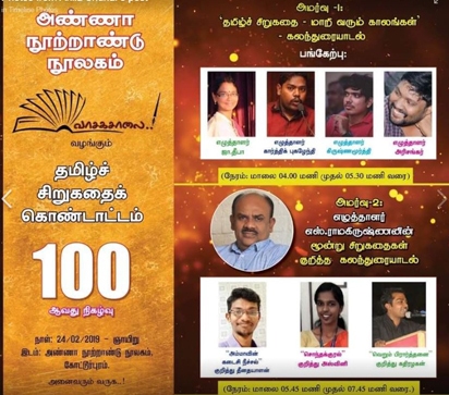 அண்ணா நூற்றாண்டு நூலகத்தில் நடைபெற்ற வாசகசாலையில் சிறுகதை கொண்டாட்டம் 100 வது நிகழ்வில் கலந்து கொண்டு உரையாற்றினேன்.