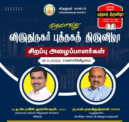 நாளை (18.11.22 வெள்ளிகிழமை) மாலை விருதுநகர் புத்தகத் திருவிழாவில் உரையாற்றுகிறேன். விருதுநகர் மாவட்டத்தில் முதன்முறையாக புத்தகத் திருவிழா ஏற்பாடு செய்யப்பட்டிருக்கிறது. மாவட்ட ஆட்சித்தலைவர் ஜெ.மேகநாத ரெட்டி சிறப்பான முன்னெடுப்புகளைச் செய்து வருகிறார். அவருக்கு எனது மனம் நிறைந்த பாராட்டுகள்.