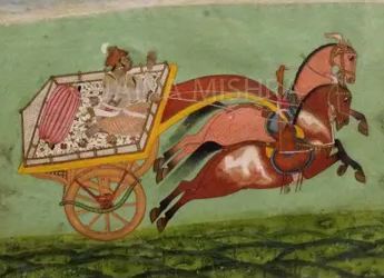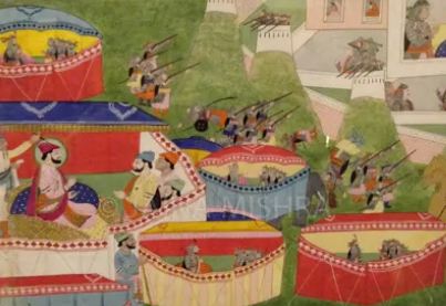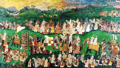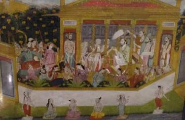 king with Ladies ஓவியத்தில் அரசன் அணிந்துள்ள பச்சை நிற உடையும் சிவப்பு கம்பளமும் அருகில் அமர்ந்துள்ள பெண்ணின் இளஞ்சிவப்பு வண்ண ஆடையும் பணிப்பெண்ணின் அடர்நீலம் மற்றும் இளஞ்சிவப்பு வண்ண பார்டரும் அத்தனை அழகாக வரையப்பட்டுள்ளன. 1780ல் வரையப்பட்ட ஓவியமிது. இது போலவே இன்னொரு ஓவியத்தில் அரசனும் அரசியும் அமர்ந்து கூக்கா படித்துக் கொண்டிருக்கிறார்கள்.