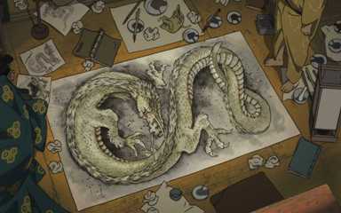 இந்தப்படத்தின் ஒரு காட்சியில் அவர் டிராகன் ஓவியம் வரைந்து தருவதாக ஒருவருக்கு வாக்களித்துப் பணம் பெறுகிறார். இதற்காக டிராகன் வரைகிறார். அவர் வரைந்த ஓவியம் மகளின் எதிர்பாராத செயலால் எரிந்து போய்விடுகிறது. அது போல இன்னொரு டிராகன் ஓவியத்தை தன்னால் வரைய முடியாது என ஹொகுசாய் கைவிட்டுவிடுகிறார். ஆனால் ஒயி இரவோடு இரவாக அதே போன்ற டிராகன் ஒன்றை வரைந்து முடித்துவிடுகிறாள்.